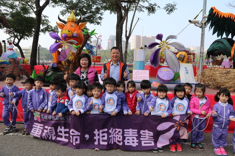 創作紫錐花反毒花燈 「紫錐花開、百毒不侵」