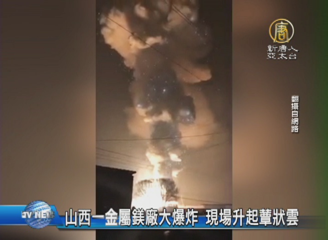 【新唐人亞太台 2017 年 02 月 08 日訊】中國山西交城的一家金屬鎂礦廠,昨晚突然發生猛烈爆炸,目前傷亡情況不明。從影片中可以看到,爆炸後現場升起一朵巨大的蕈狀雲,起火爆炸的廠房,也燃起數米高大火,並升起濃煙。隨後當地消防隊也在官方微博發佈消息,證實了這起廠房起火,但由於官方對相關爆炸消息進行過濾及封鎖,中新網的相關報導也被迅速刪除,外界對此次爆炸的原因,以及火勢控制情況,仍待進一步瞭解。