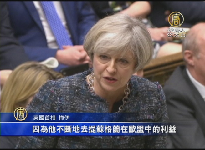 【新唐人亞太台 2017 年 02 月 09 日訊】歡迎回來,最新國際消息再來看到,英國下議院今天以壓倒性的多數通過議案,授權首相梅伊,展開為期兩年的脫歐談判。不過,針對 蘇格蘭民族黨國會領袖羅伯森說,如果脫歐談判失敗,應該再次啟動蘇格蘭脫離英國的公投,會上,梅伊也表達強烈的回應。
