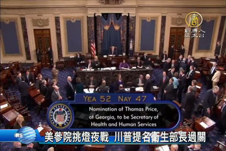 【新唐人亞太台 2017 年 02 月 10 日訊】新聞首先來看到,美國總統川普的內閣人選又有一人過關,他是衛生部長人選普萊斯 美國參議院挑燈夜戰,直到周五凌晨才表決普萊斯的任命案,以52票對47票通過,未來普萊斯將負責操刀,把川普揚言取消的「歐巴馬健保」給砍掉,普萊斯將主管高達1兆美元,約31兆元台幣的衛生預算。