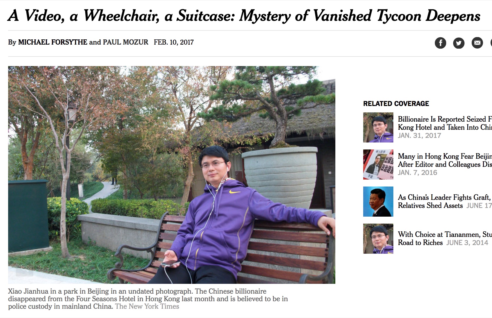 2月11日,美媒紐約時報引述知情人士的話說,肖建華在上月27日(大年除夕)凌晨,被6個身份不明男子用輪椅推出香港四季酒店,被帶走時,肖的頭部看似被床單或毛毯覆蓋。 (截圖/紐約時報網站)