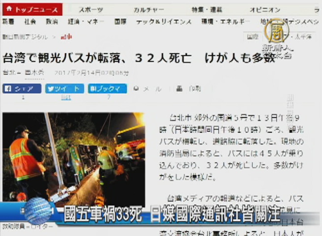 【新唐人亞太台 2017 年 02 月 14 日訊】國五車禍,奪走33條人命,許多國際媒體昨夜也以快訊報導。包括,法新社、美聯社、路透和英國BBC都跟進報導,其中英國BBC報導稱,台灣被認為是世界上最安全的地方之一,但有批評指出,台灣的安全標準需要改善。另外,包括《產經新聞》、NHK、《每日新聞》和《朝日新聞》等日本主流媒體的網站,都報導了台灣這起重大車禍。