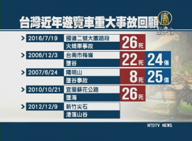 【新唐人亞太台 2017 年 02 月 14 日訊】觀眾朋友應該還記得,去年7月,才發生了震驚各界的國道遊覽車火燒車事故造成26人罹難,現在又發生遊覽車翻覆33人死亡的重大車禍,事實上。近11年來,台灣已經發生至少6次極重大的遊覽車事故,失去128條寶貴的性命。