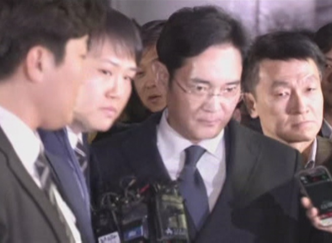 新唐人南韓記者 金燕:「好的,主播,48歲的三星集團副會長李在鎔,今天凌晨被正式逮捕,南韓法院同意檢方以賄賂、偽證、侵占等罪名,正式羈押李在鎔。這是南韓三星集團成立70多年來,首次有領導人被捕,對此三星集團表示,將盡全力在以後的法院訴訟中,確保事實真相揭露。而三星電子股價今天早盤一度下跌1.6%,另外,南韓獨立檢察組也將加快對南韓SK海力士、樂天集團及總統朴槿惠的調查進度。案件波及範圍是否擴大,我們將持續為您關注,主播」