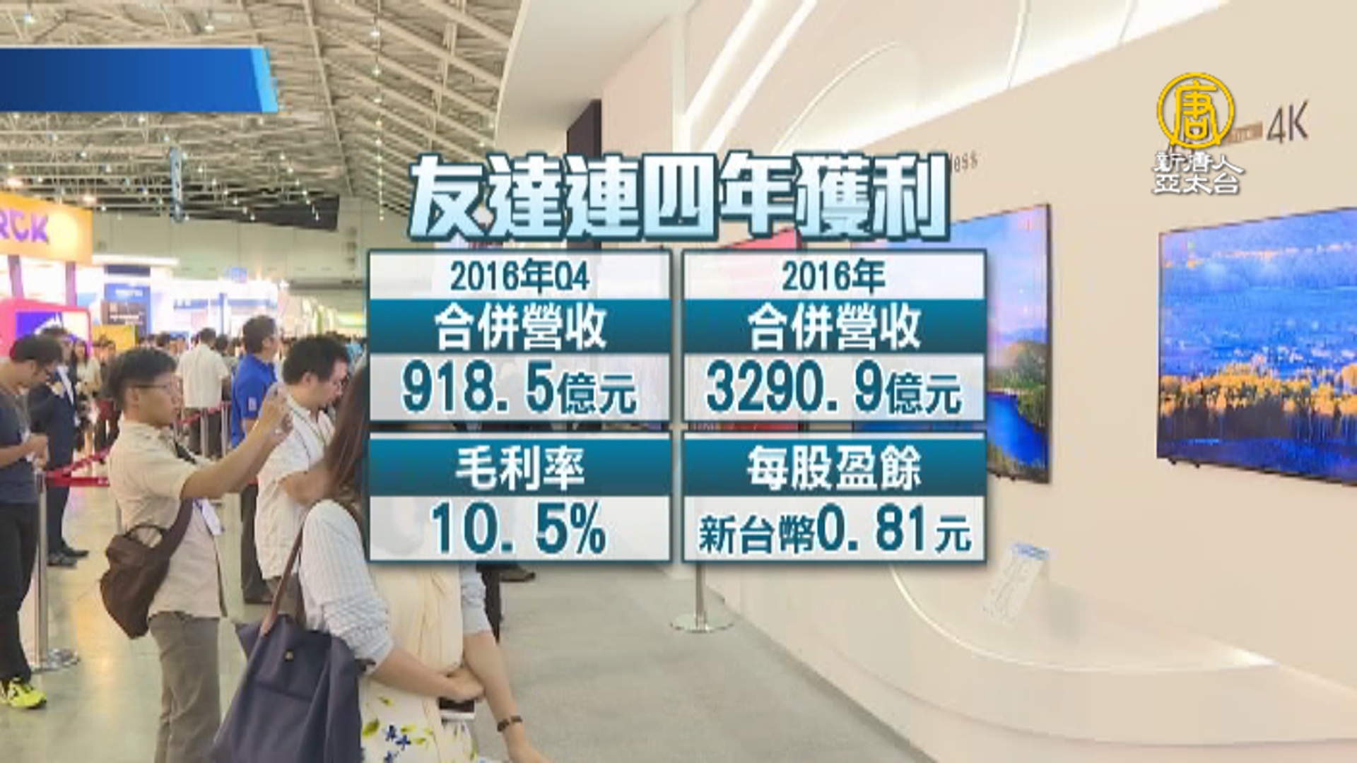 4K高畫質ALCD螢幕,在國際間打響名號,國內面板雙虎之一的友達,2016年實現連續四年獲利目標,去年第四季合併營收為新台幣 918.5 億元,年成長 10.1%,全年合併營收3,290.9 億,毛利率 10.5%,每股盈餘為新台幣 0.81 元。
