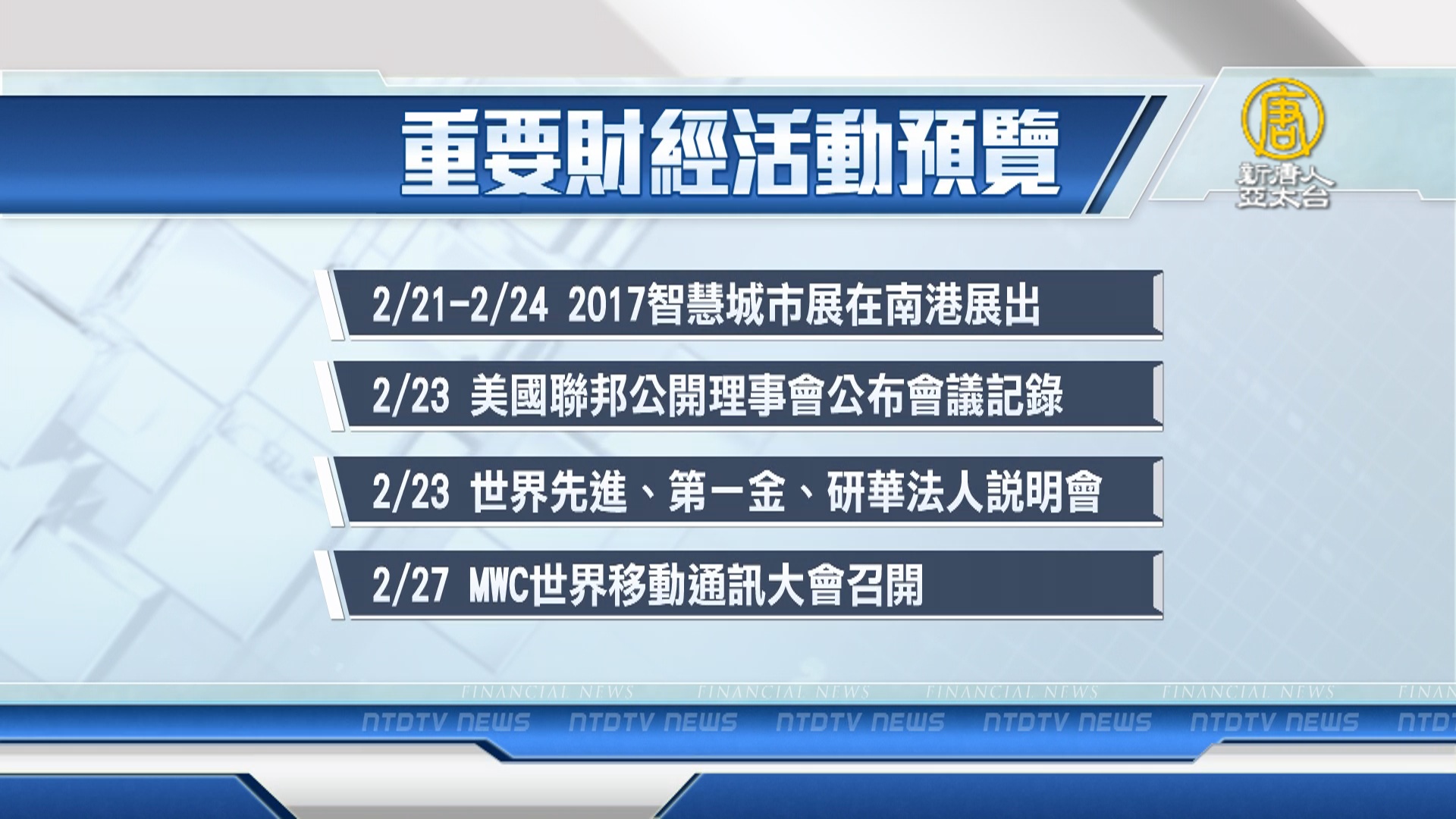 【新唐人亞太台 2017 年 02 月 19 日訊】帶您看到下週,有哪些重要的財經活動。