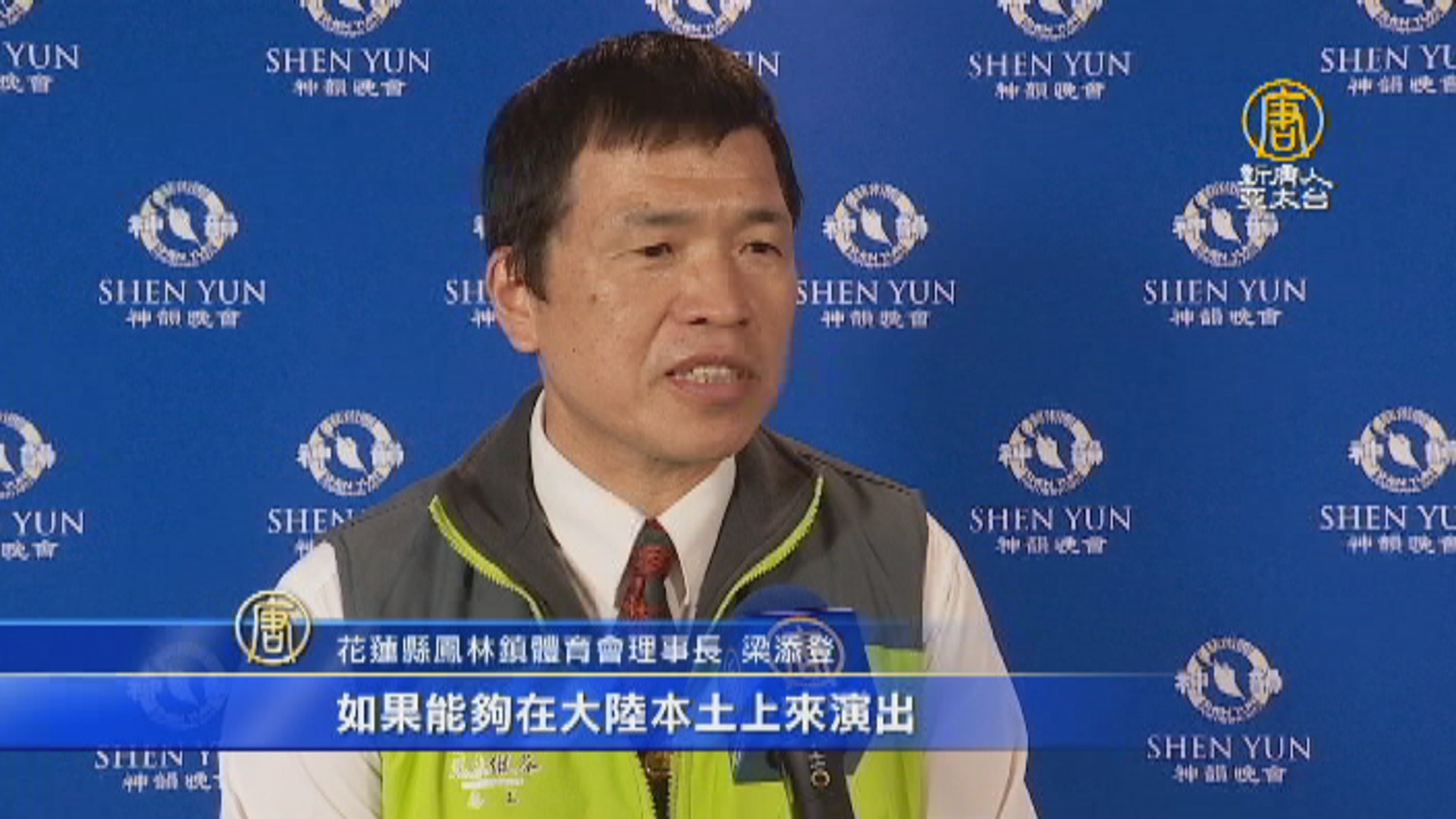 花蓮縣鳳林鎮體育會理事長 梁添登:「邪不勝正,就說你要在從事惡的時候一定會受到良心的譴責,那我是覺得說,這一個節目能夠在大陸上演出,讓大陸的我們自己的人民也可以看的到這麼好的節目。如果能夠在大陸本土上來演出,讓民眾真正瞭解大法的好。」