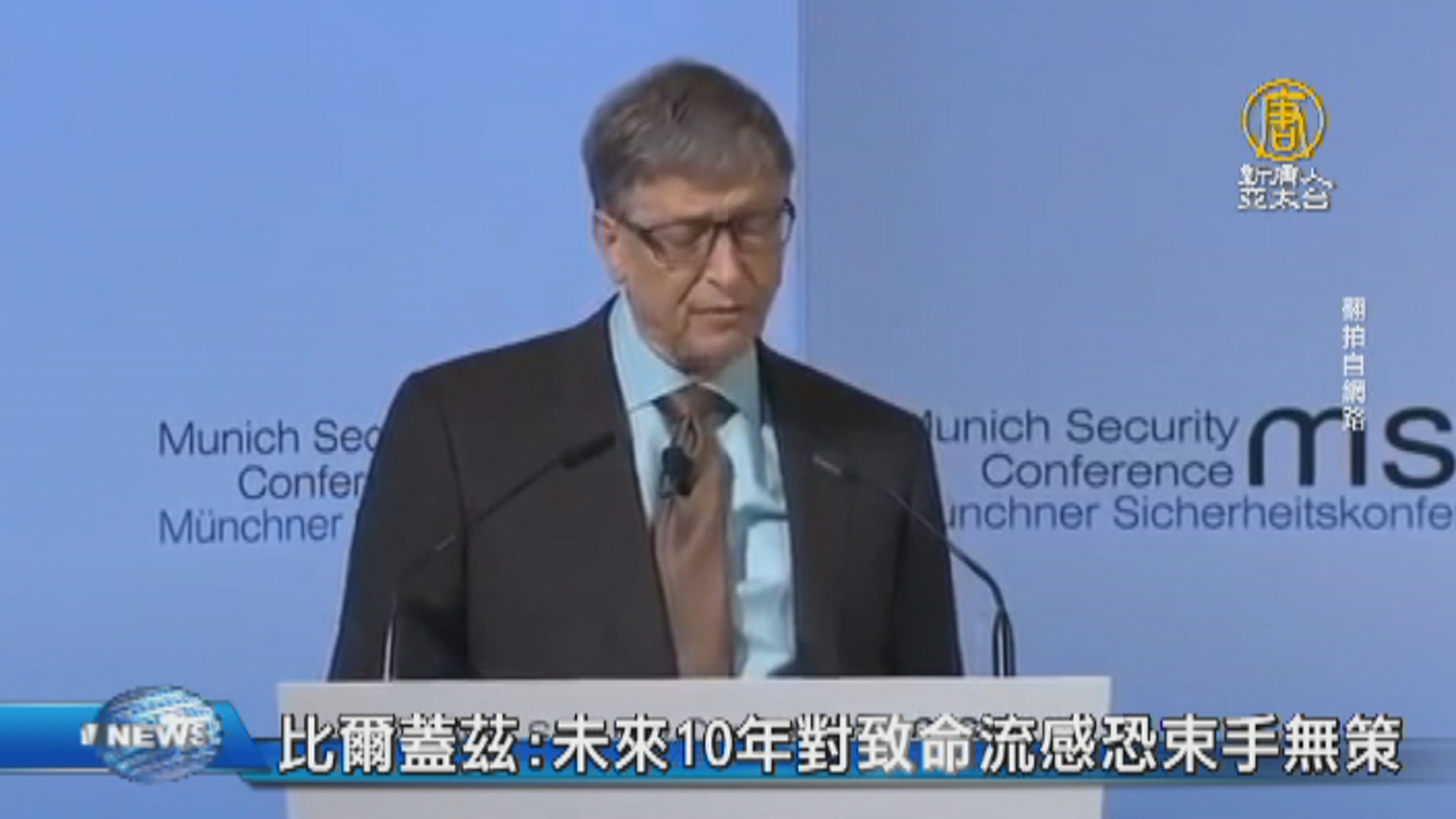 【新唐人亞太台 2017 年 02 月 21 日訊】歡迎回來。中國、南韓、日本、台灣都相繼傳出禽流感,而微軟創辦人比爾‧蓋茲 在德國慕尼黑安全會議演講時指出,國際間忽視了衛生安全及國家的關聯性,一旦生物恐怖主義快速崛起,最快在10年內將會爆發,全球對於迅速蔓延的致命流感,更將束手無策。