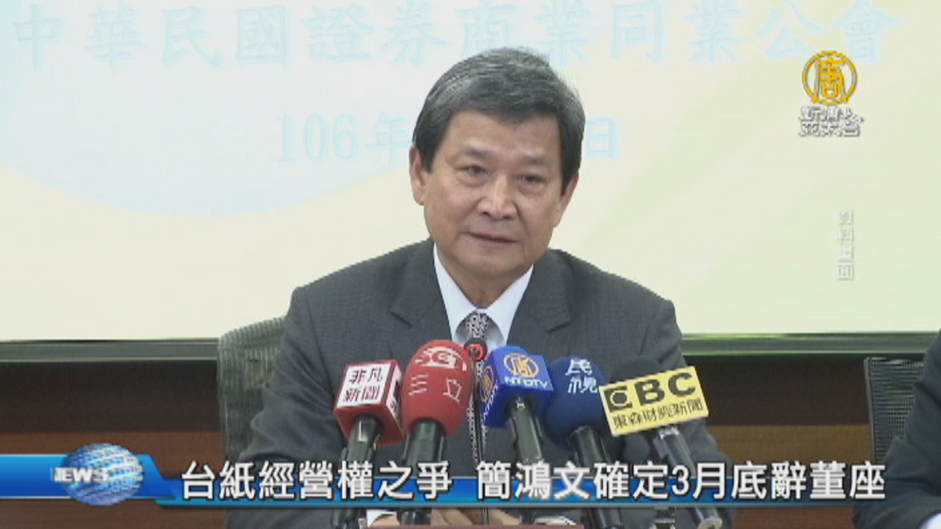 【新唐人亞太台 2017 年 02 月 24 日訊】台紙經營權之爭今天出現新進展,據自由時報報導,台紙董事長簡鴻文已經在今天稍早向財政部遞交承諾書,將於3月31日前辭去台紙董座,並退出家族企業,以保住兆豐證券董事長一職;財政部將待簡履行承諾、正式卸任台紙董座後,核准其於兆豐證券的延任案。