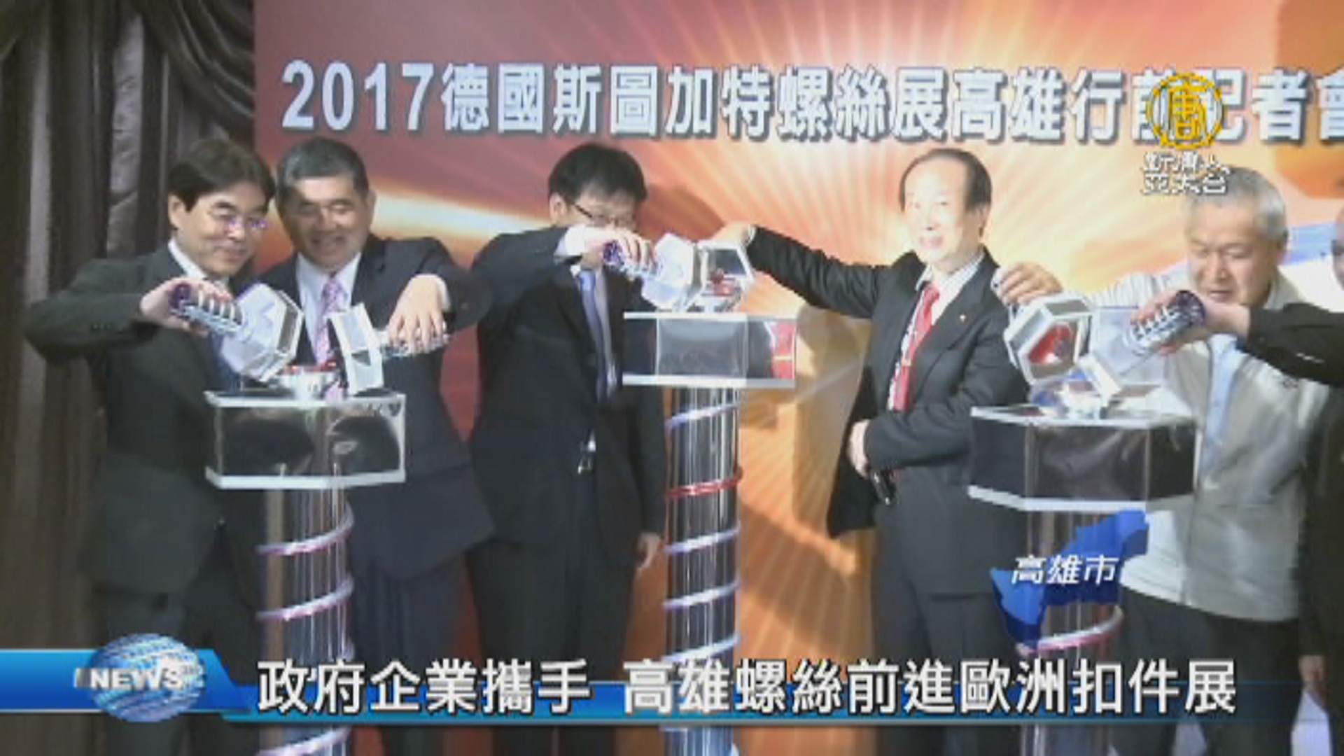 拿起螺絲造型的瓶子,將紅酒倒入高台中,高雄市政府與高雄螺絲公會,舉辦「2017德國斯圖加特螺絲展」行前記者會,宣布將於3月28日率領49家高雄螺絲業者,前進歐洲最大的扣件展。