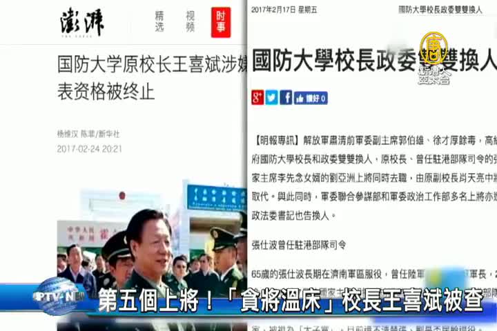 【新唐人亞太台 2017 年 02 月 25 日訊】下週,中共兩會,就要登場,不過,帶您注意,在兩會開幕之前,中共高官的落馬,可也是不斷,第五名落馬的上將,是中共國防大學的原校長,上將王喜斌,證實已經因涉嫌職務犯罪遭到調查。