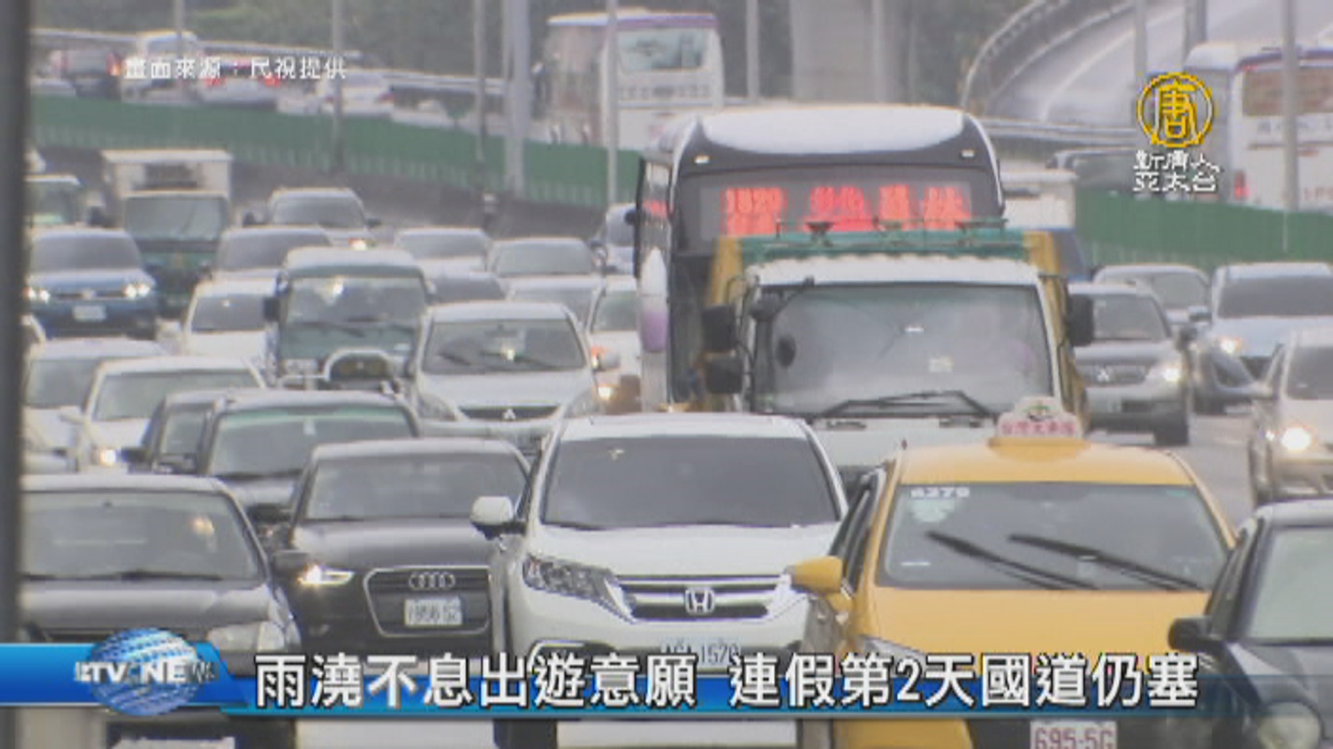 【新唐人亞太台 2017 年 02 月 26 日訊】連假第2天,雖然天氣有雨,仍舊澆不息民眾出遊意願,國道部分路段依舊出現壅塞情況,不過高工局表示,相較於昨天,今天(26日)車潮大約少了一成五左右,至於國道5號,在晚間8點解除高乘載後,車流量增多,預估恐怕到凌晨1點才會紓解。