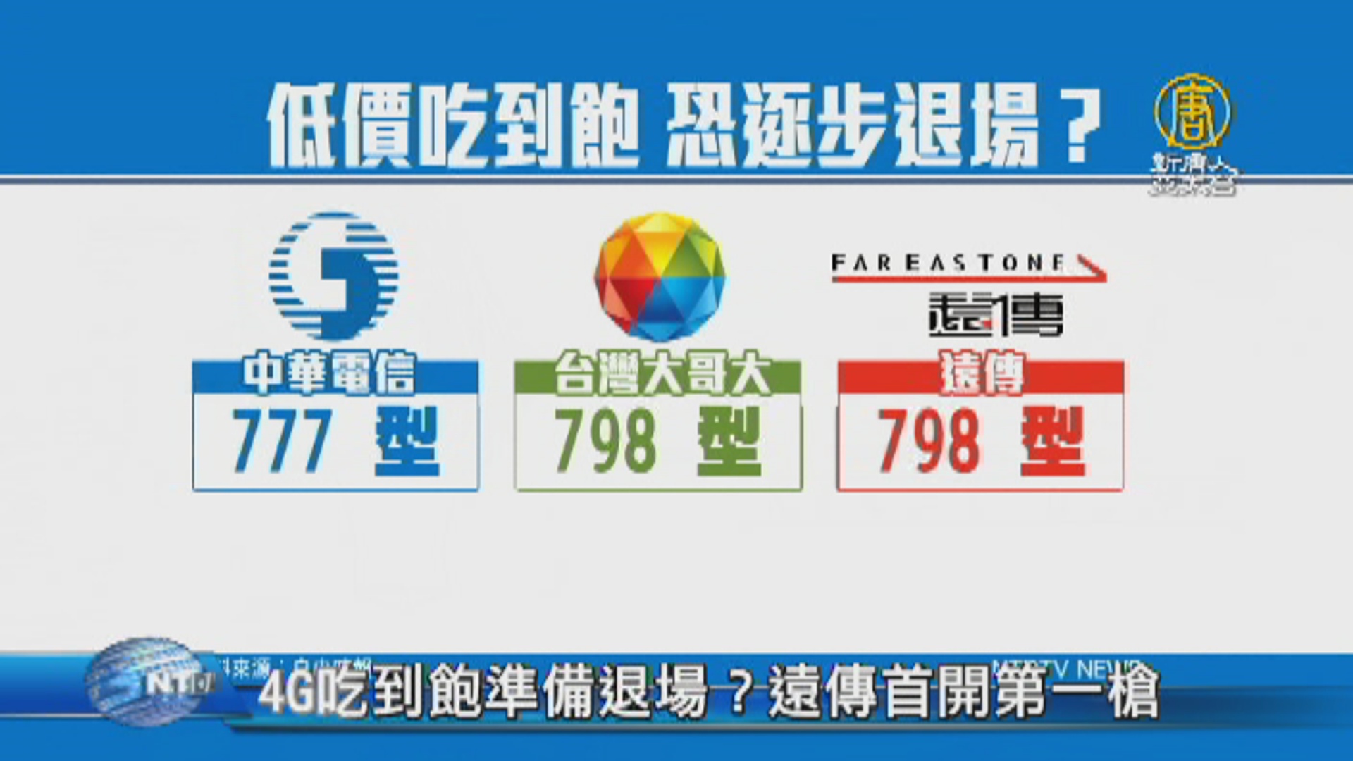 【新唐人亞太台 2017 年 02 月 27 日訊】電信業者競爭激烈,過去4G 低價吃到飽,延續很長時間,如今傳出電信業者遠傳開第一槍,698 元吃到飽已於上周正式退場,改由798 元方案接軌,有通訊行業者傳出,台灣大也規劃 3 月 1 日退場,引起外界關注。