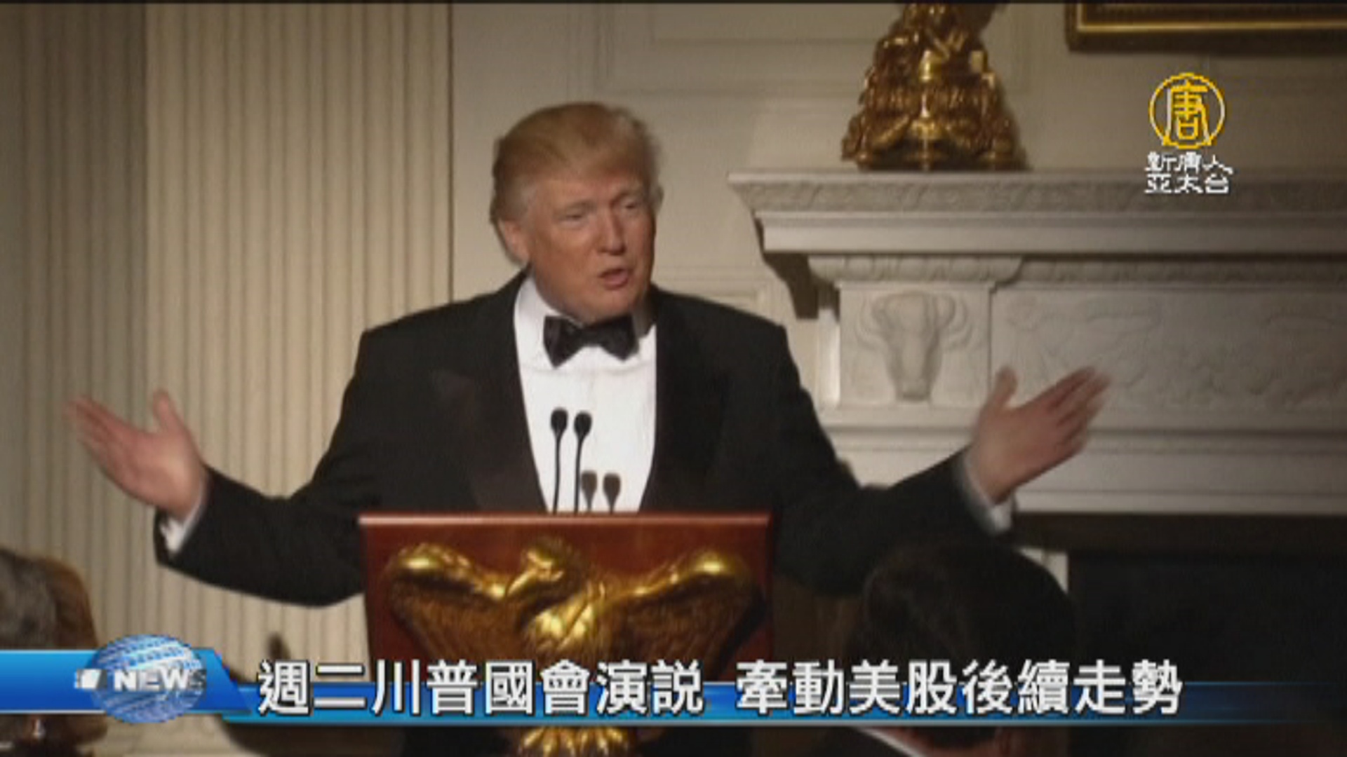 【新唐人亞太台 2017 年 02 月 27 日訊】歡迎回來,美國總統川普,明天(28日)將對國會兩黨發表演說,內容涵蓋健保、基礎建設和稅改等議題。外界普遍預測,若川普本週二的演說,能清楚交代政策進展,與時程規劃,將有望加強市場上升趨勢,帶動美股繼續攀升。