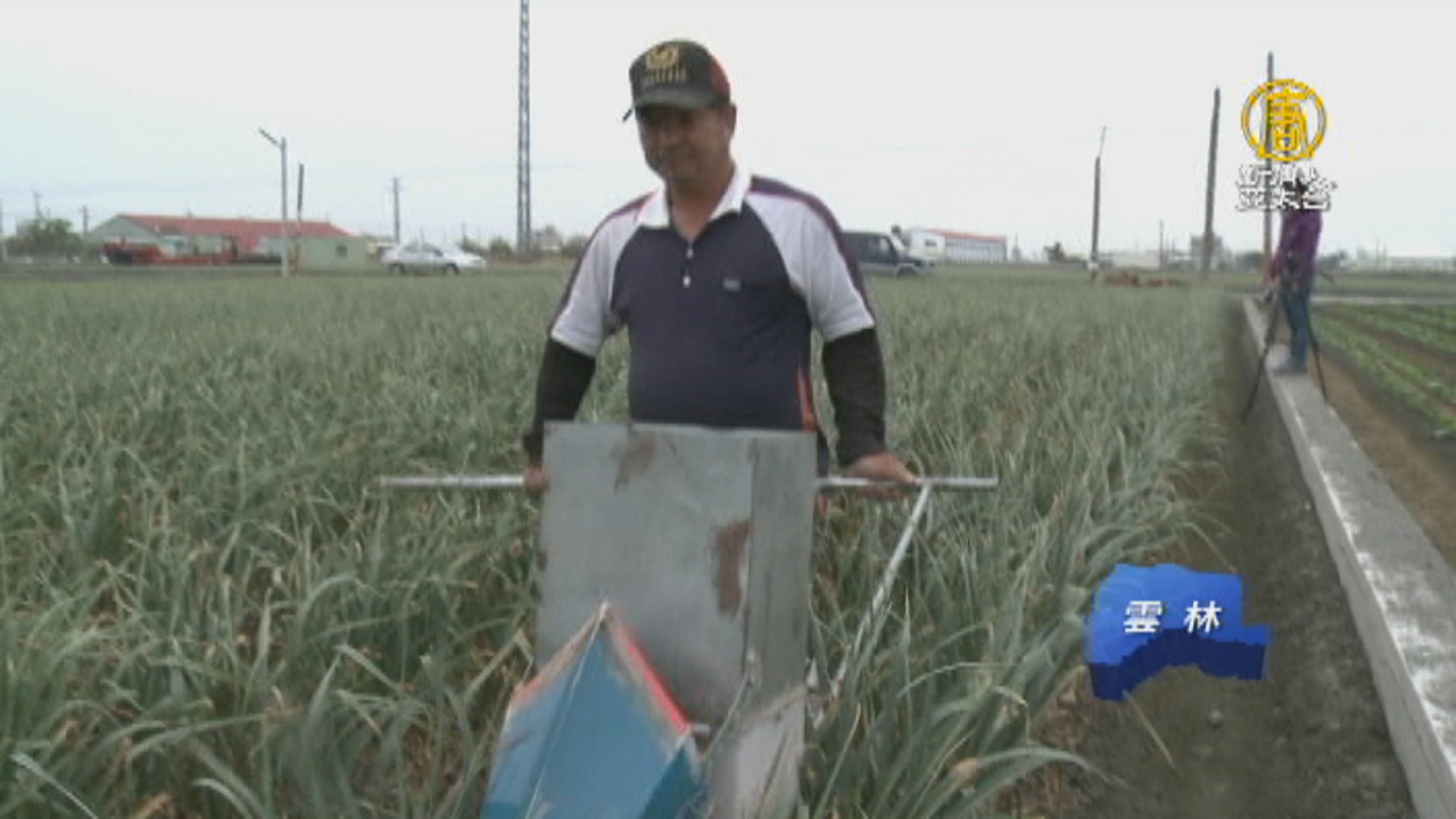 【新唐人亞太台 2017 年 02 月 28 日訊】繼續也是一樣在雲林的故事。農友 張永新,深感農民彎腰播種花生的辛勞,用兩年時間研發改良機具,成功發明「花生蒜頭混種」的土豆機,不僅可省下25倍人力,而且造價低廉,渴望解決農村缺工的難題。