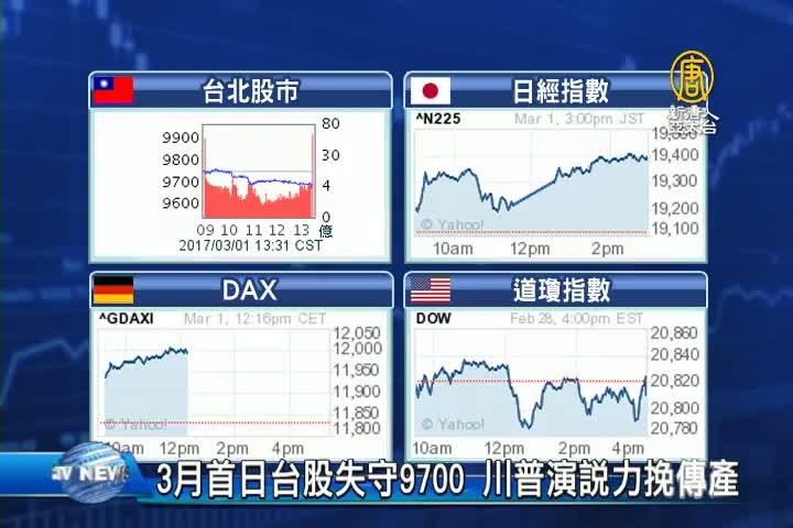 【新唐人亞太台 2017 年 03 月 01 日訊】美國總統川普提出 1 兆美元的基礎建設計畫,激勵鋼鐵、水泥等傳產股持續走強,不過電子權值股卻出現斷電,來關心台股,今天台積電開低走低跌破月線,聯發科、鴻海、鴻準及傳產股台泥、亞泥、中鋼、統一等大型權值股 則守住紅盤。收盤下跌75.69點,收在9674.78點,成交金額為981.00億元。 另外,市場對於美國聯準會3月升息的預期心理轉濃,亞幣 應聲走跌,台幣兌美元今天重貶1.1角,收在30.76元。
