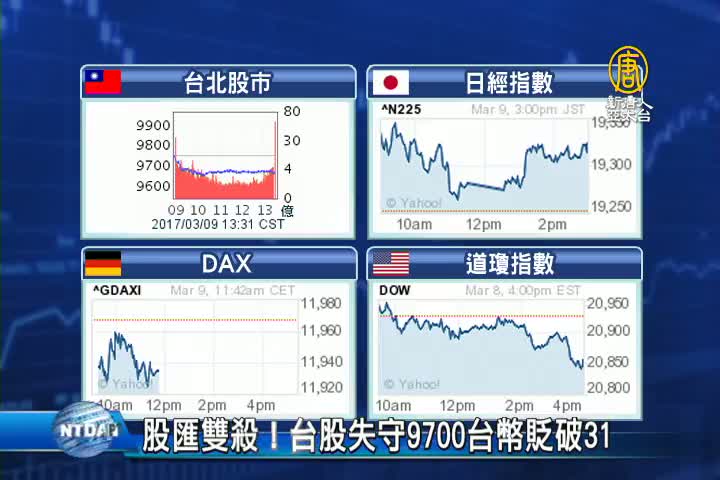 【新唐人亞太台 2017 年 03 月 09 日訊】最近聚焦在美國升息議題,影響新台幣匯率變動及外資進出台股態度,加上國際油價暴跌 。 亞洲股市今天表現普遍不振,台股受到影響,今天主要三大類股電子、金融、傳產全部熄火,台股盤中跌幅一度超過百點,終場下跌94點,收9658點,失守9700點大關及失守5日線,成交量885億元。 另外,在美元指數持續走升下,台幣再度貶破31元大關,終場重貶1.55角,以31.02元兌1美元作收。