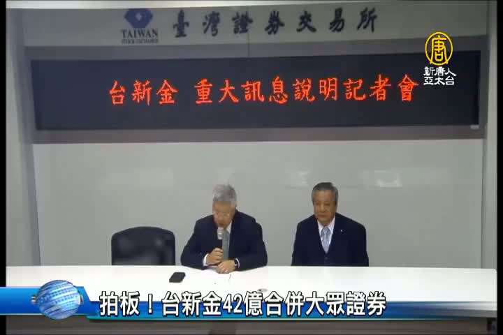 【新唐人亞太台 2017 年 03 月 10 日訊】今天台新金,傍晚召開重大說明,表示旗下台新證券,將以每股11.2元、總價新台幣42.3億元,現金收購大眾證券,100%股權,合併後由台新證券為存續公司,並且在證券經紀市占率,台新證將提到1.22%,排名第24,成為中型券商,雙方並將在本月13日簽約,報請主管機關核准後生效。