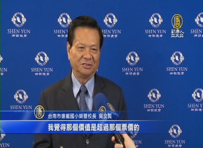 台南市億載國小榮譽校長 吳文賢:「每一個舞蹈演員的動作,力與美的表現啊,真的是令人刮目相看。像《小和尚》也好啦,打鼓也好啊,音樂的節奏真的太棒了!我看過那麼多的團體啊表演,沒有像(神韻)這樣的。」