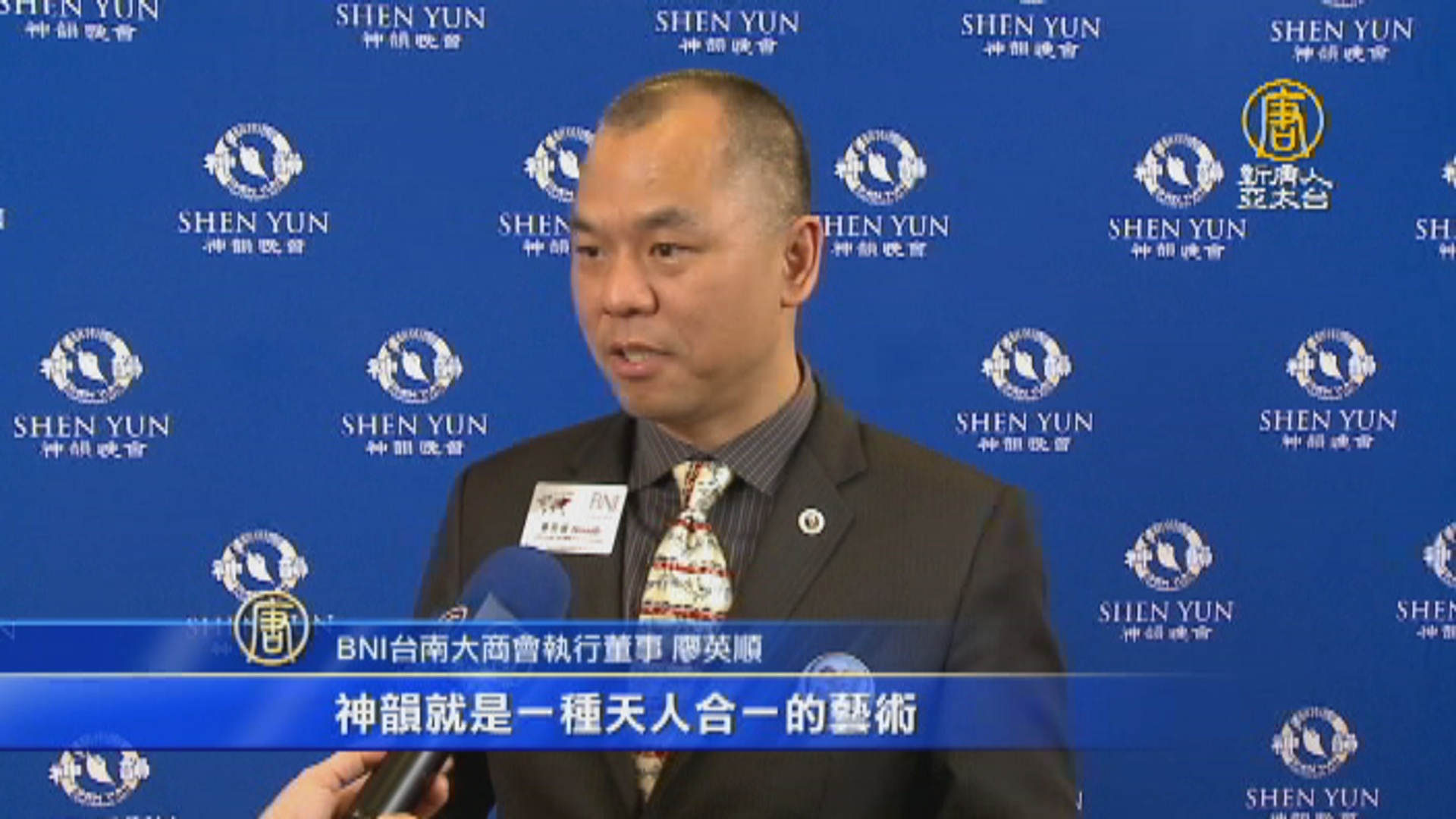 BNI台南大商會執行董事 廖英順:「中國所謂天人合一的概念,她其實在我們現實的社會裡面,你除非靠靜坐、打坐才有辦法去想像那樣的東西,可是在神韻的節目裡面,透過很具象的天幕的設計,這個概念,讓我們想像變成一個看的到的畫面。」