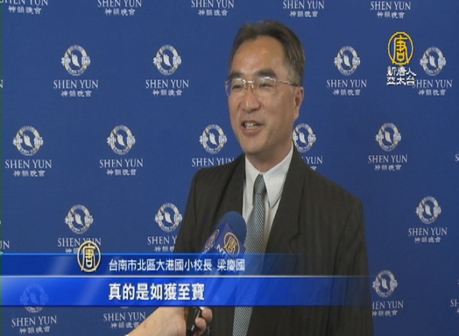 台南市北區大港國小校長 梁慶國: 「每一年的欣賞當中都讓我非常陶醉,他們是零瑕疵的,而且整個燈光、畫面、舞蹈、還有給人的感受,尤其是有歌唱的節目,都非常的完美無缺,所以今天來欣賞神韻的演出,真的是如獲至寶。」
