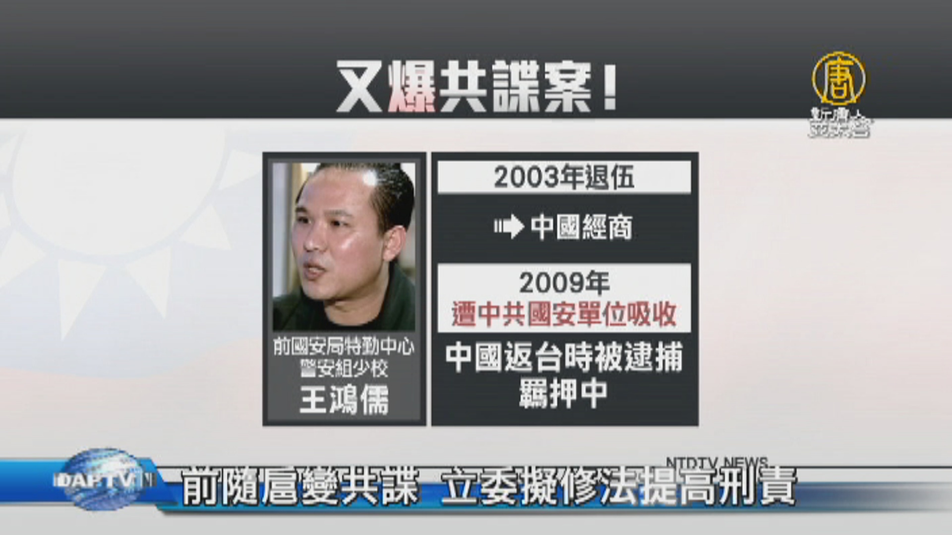 【新唐人亞太台 2017 年 03 月 16 日訊】又有共諜案發生!調查局查獲曾擔任前副總統呂秀蓮隨扈的前國安局少校王鴻儒,退伍後到中國經商,被中共吸收。13日王鴻儒返台遭逮捕羈押。立委表示,過去共諜案往往都是輕判,無法有效嚇阻,因此將研議修法,提高刑責。