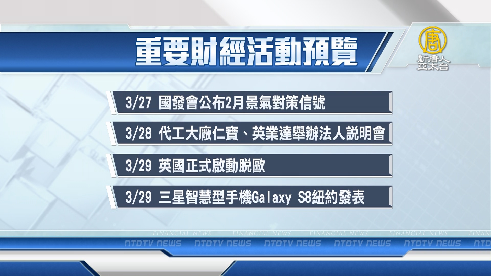 【新唐人亞太台 2017 年 03 月 26 日訊】帶您看到下週,有哪些重要的財經活動。