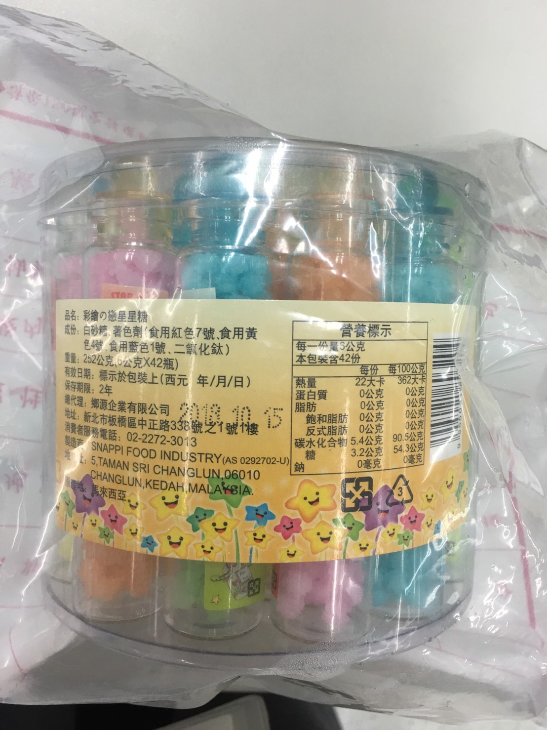 台北市衛生局專案檢查52件包裝食品標示,1件產品「彩繪の戀星星糖」,檢出著色劑黃色五號,惟外包裝標示未標示,經查產品來源廠商為新北市業者,已移請轄管衛生局辦理。包裝食品未詳實標示食品添加物者,可依違反食品安全衛生管理法第22條第1項之規定,爰依同法第47條處新台幣3萬元以上300萬元以下罰鍰;標示不實者,則依違反食品安全衛生管理法第28條及第45條規定,處分新台幣4至400萬元罰鍰;此外,另依同法第52條第1項第3款規定,命業者將違規產品限期回收改正,改正前不得繼續販賣。