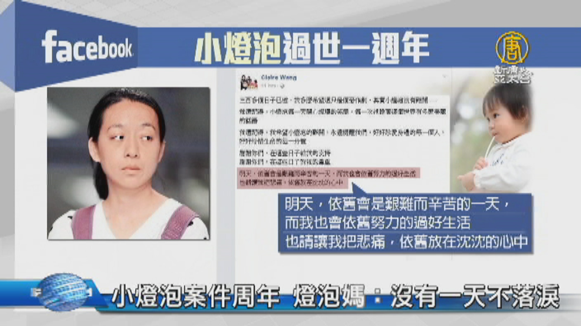 【新唐人亞太台 2017 年 03 月 28 日訊】歡迎回來。今天是台北市內湖女童小燈泡命案一周年,小燈泡的媽媽王婉諭,在女兒忌日這一天,按照例行,到司法院參加司改國是會議開會,前一天在臉書吐露心情,她說這一年來,她沒有一天不落淚,沒有一天不想念。