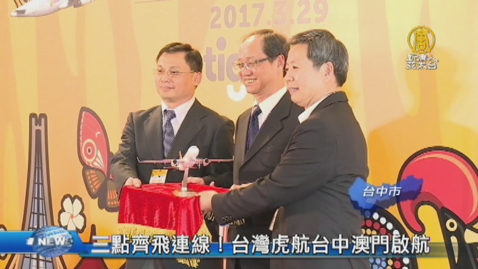 【新唐人亞太台 2017 年 03 月 29 日訊】台中國際機場升格後積極拓展航線,也向廉航招手,今天(29日)台灣虎航開啟從台中飛澳門航線首航,不只讓中部民眾節省時間,這也是虎航第三條飛澳門的航線,讓往返兩地的旅客有更多選擇。