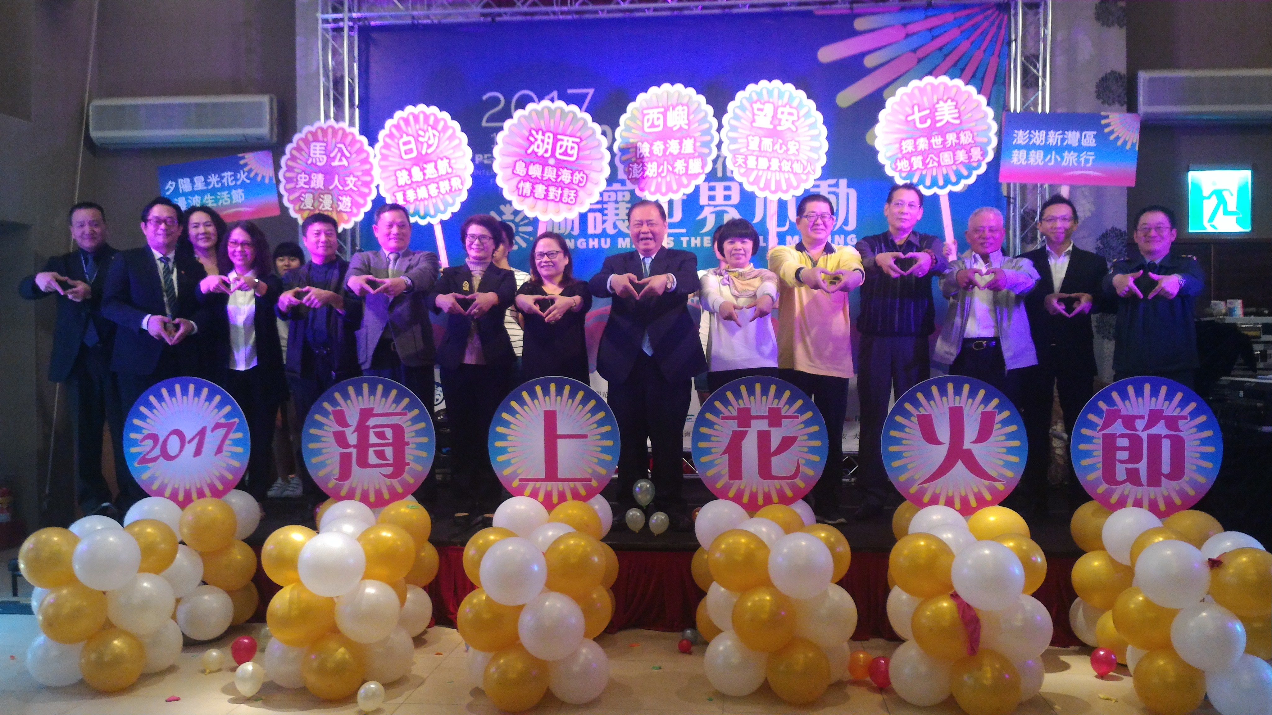 「世界最美麗海灣,澎湖讓世界心動!」記者會上彩色氣球齊飛,澎湖縣長陳光復、航空海運及各產業協會代表,一個個比出心型手勢,宣告今年花火節將心動登場,打造「五感全開的花火震撼」。