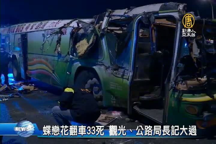 【新唐人亞太台 2017 年 03 月 31 日訊】帶您看到,上個月中旬,蝶戀花賞櫻團遊覽車,在國道五號翻車,造成33死、11傷;對此,觀光局長周永暉和公路總局局長陳彥伯一度請辭、但是沒有獲准;交通部後來 召開考評會,決議對兩局長各記一大過,另外,有七名相關官員各記一小過。全案仍待交通部長賀陳旦簽核。