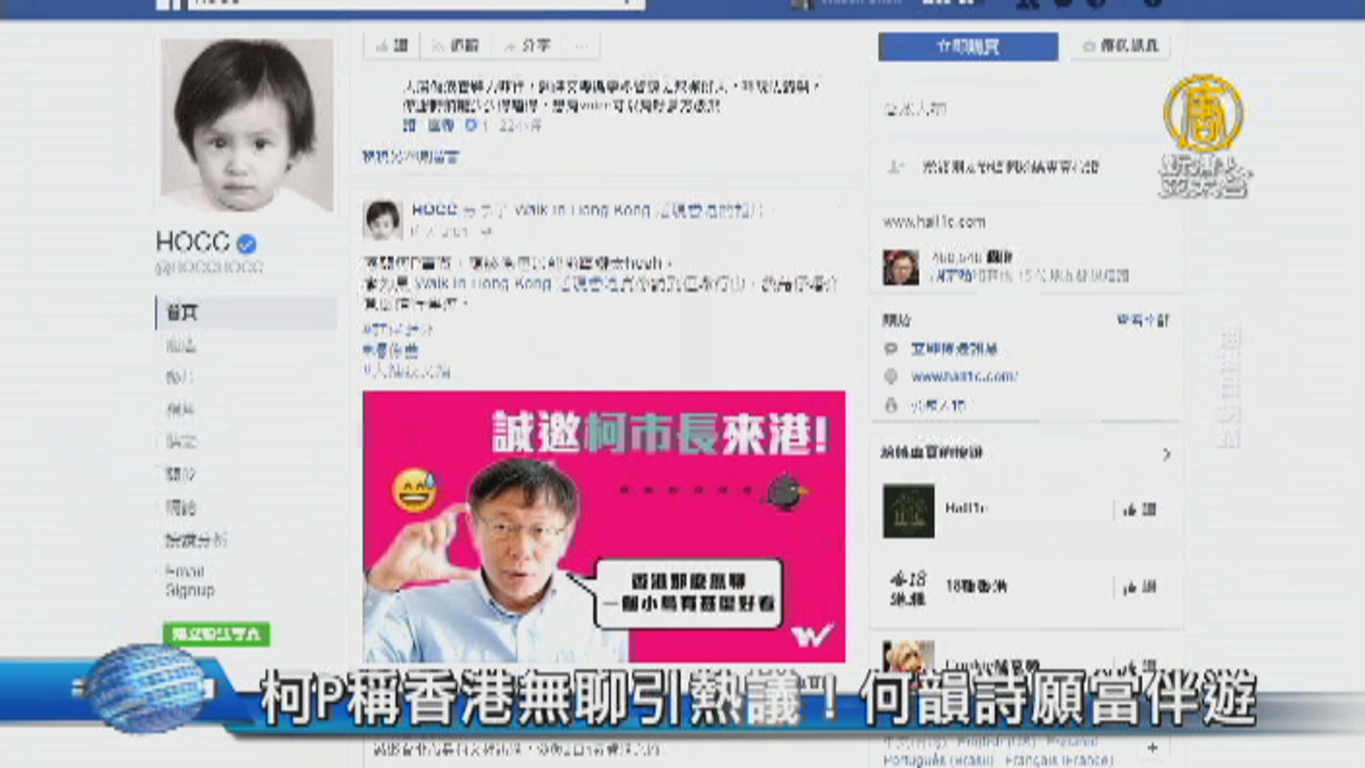 【新唐人亞太台 2017 年 03 月 31 日訊】台北市長柯文哲日前在泰國推展觀光時,被問到來台旅遊人次,是否有望打敗香港。柯文哲語出驚人表示:「香港很無聊,香港一個小島有什麼好看的」。言論一出,立刻引發港台網友熱烈討論。對此,香港歌手何韻詩也表示,下次柯文哲如果要來香港,不介意當他的伴遊。
