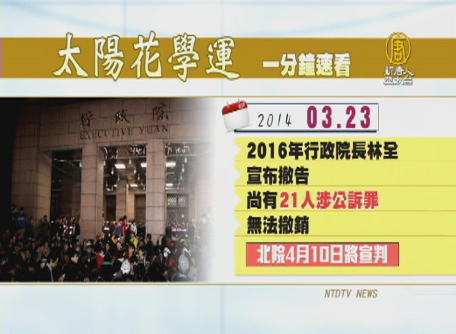 【新唐人亞太台 2017 年 03 月 31 日訊】太陽花攻佔立法院,22名被告一審全部獲判無罪,立法院長蘇嘉全今天回應,對於法院的判決相當尊重,因為司法是獨立的。而太陽花學運所有抗爭行動中,還有哪些案件,目前審理進度又是如何?一分鐘,帶您快速掌握。