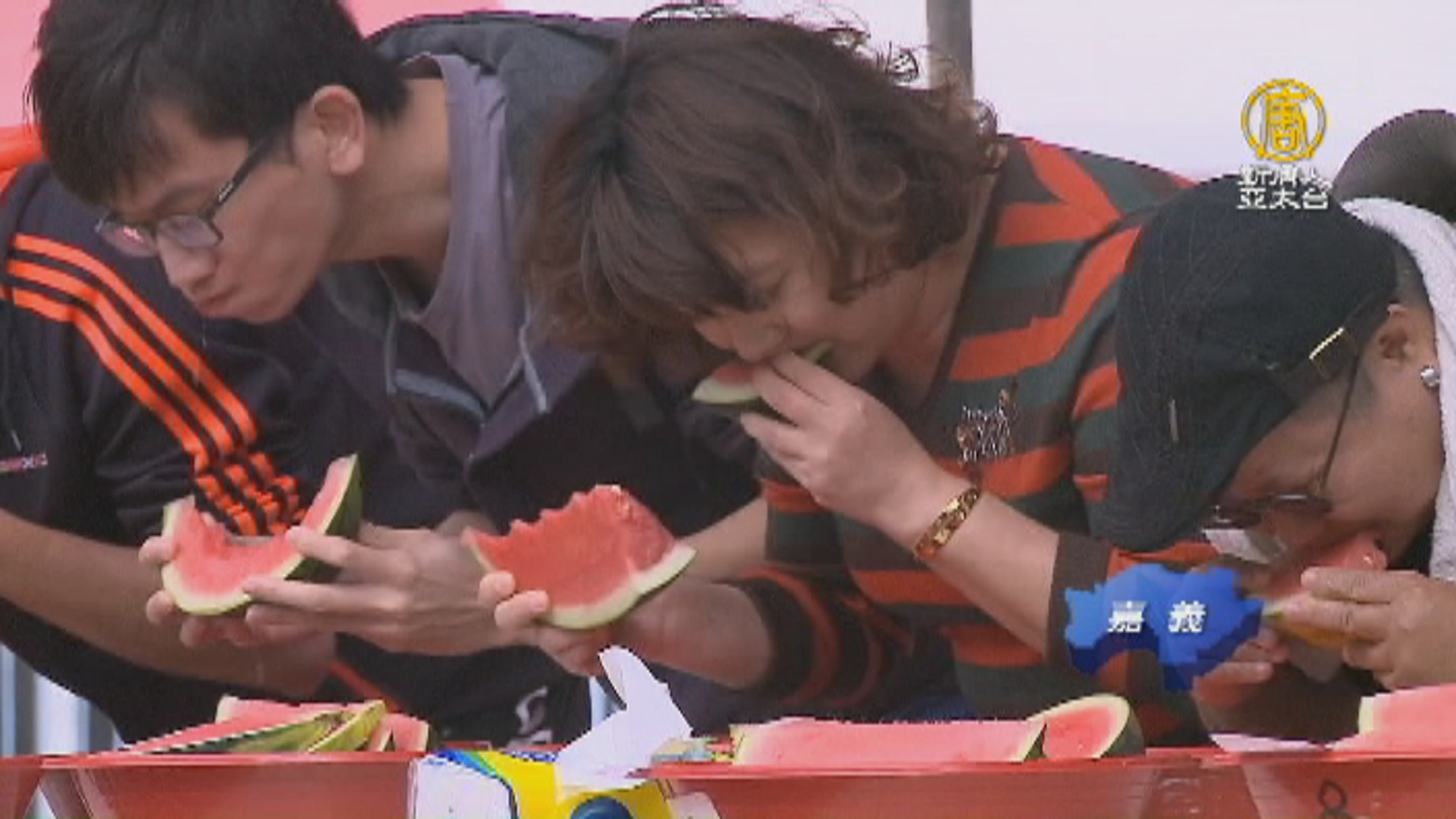 一盤盤切好的西瓜擺在長桌上,哨聲一響!參賽者顧不得形象,拿起西瓜大口大口的吃了起來;主辦單位表示,參加「西瓜大胃王」比賽,每梯次的前三名都可以獲得一顆大西瓜,現場加油聲不斷!