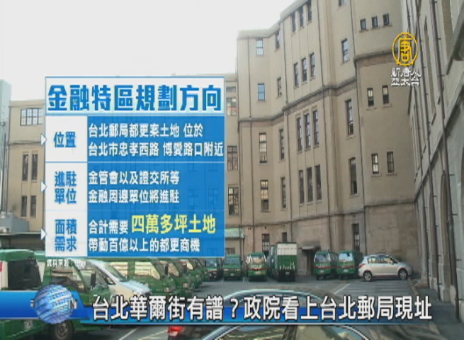 【新唐人亞太台 2017 年 04 月 03 日訊】政府醞釀打造「台北華爾街」金融園區,讓金融周邊單位群聚,不過台北市土地寸土寸金,原本一度規劃要在台北市華光社區,但有平面報導指出,行政院看上台北郵局,想要把位在台北市忠孝西路的台北郵局,搬遷到華光社區,而在台北郵局現址,設置金融特區。