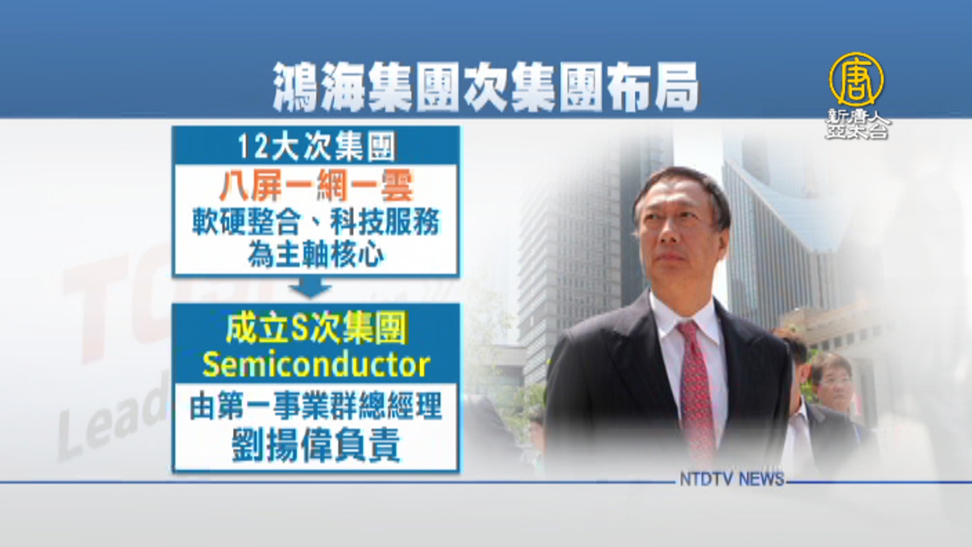 日本最大經濟團體 經團連會長?原定徵 曾公開表示:東芝的半導體技術是日本的核心技術。為贏得東芝半導體的關鍵技術,平面媒體報導,鴻海集團總裁郭台銘繼原有的12大次集團,成立最新的S次集團,S指的是Semi conductor,將半導體事業的層級拉高到次集團上,由第一事業群總經理劉揚偉負責。