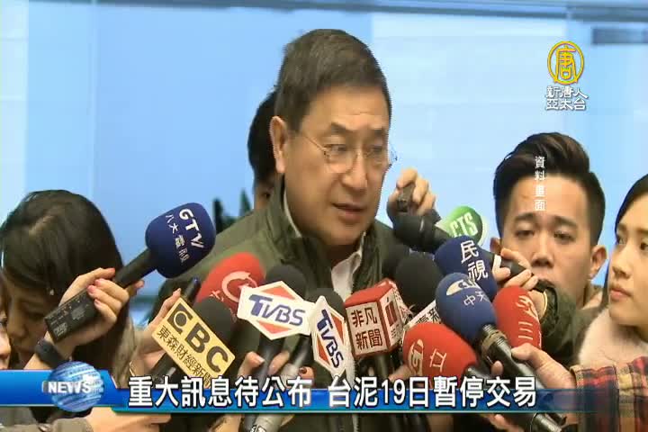 【新唐人亞太台 2017 年 04 月 19 日訊】台泥向證交所申請今天暫停交易,因為有重大訊息待公布。據了解,台泥今天將召開臨時董事會,預計會後召開重大訊息公告,由於這是辜家女婿張安平接下台泥董事長之後首次暫停交易,引來市場高度關注。張安平曾透露,要將公司觸角從中國大陸延伸到歐美等先進國家,是否與收購或是處分資產有關,引發外界想像空間。