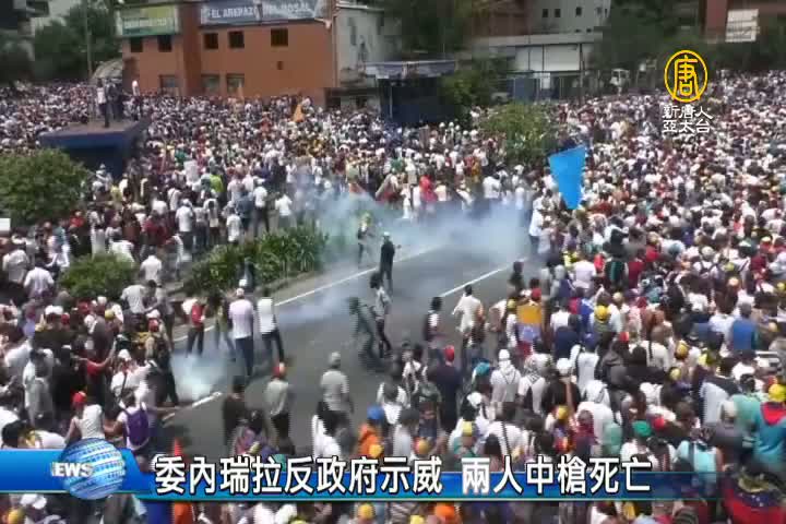 【新唐人亞太台 2017 年 04 月 20 日訊】委內瑞拉民眾不滿經濟低迷,以及 總統馬杜羅獨裁,要求他下台。 抗議民眾在首都卡拉卡斯發起大型示威,民眾與保安人員衝突,當局發射催淚彈,據報已經兩人死亡。目擊者說,其中包括一名18歲的學生。馬杜羅批評示威者形同「政變」,還指責美國政府為軍事介入製造籍口,當地情勢引發美洲國家關注。