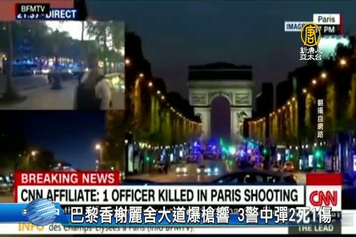 【新唐人亞太台 2017 年 04 月 21 日訊】距離法國總統大選還有2天,巴黎香榭麗舍大道發生疑似恐怖攻擊,這是在台北時間今天凌晨4點多,據外電報導,有3名警察中槍2死1傷。槍手當場也被擊斃,當時這名槍手,是朝警察開槍,確切動機有待調查。不過,法國即將舉行第一輪總統大選,本周二才逮捕有意在選前策畫恐攻的極端份子,因此,當局將朝恐攻方向調查。