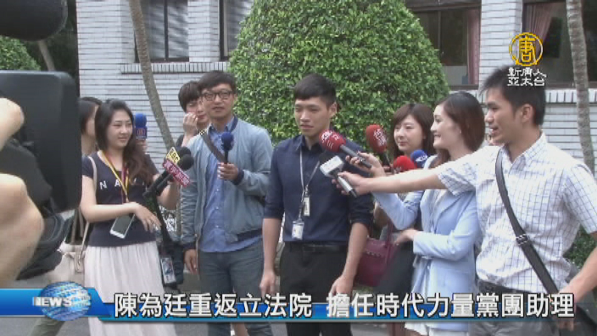 【新唐人亞太台 2017 年 04 月 21 日訊】318學運代表陳為廷退伍之後,今天(21日)到時代力量黨團擔任助理。第一天到立法院上班,陳為廷被媒體團團包圍,面對提問也是有問必答。