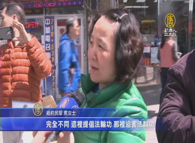 紐約民眾 蔡女士:「完全不同啊,這裏(美國)是提倡法輪功,那裏(中國)是迫害法輪功。」