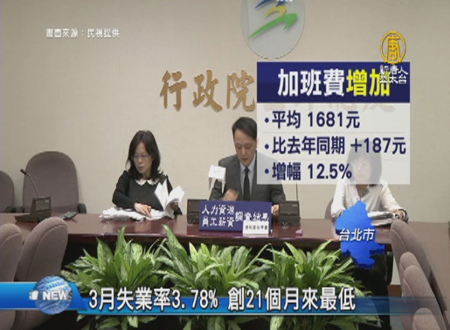 【新唐人亞太台 2017 年 04 月 24 日訊】歡迎回來。主計總處公佈,3月的失業率,是3.78%,創下21個月以來最低,不過主計總處同步公布,國人經常性薪資來到39520元,而且一例一休上路之後,上班族平均加班費增加了1681元,這個數字,民眾說,是假的。