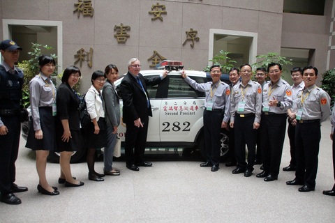 John G.Jung強調,「雲端智慧巡邏車」這整套系統,是智慧先進科技守護城市的代表,這麼先進科技應用值得全世界借鑑,更具有高度商業價值。在市警局與接待主管合影留念。(圖/嘉義市政府提供)