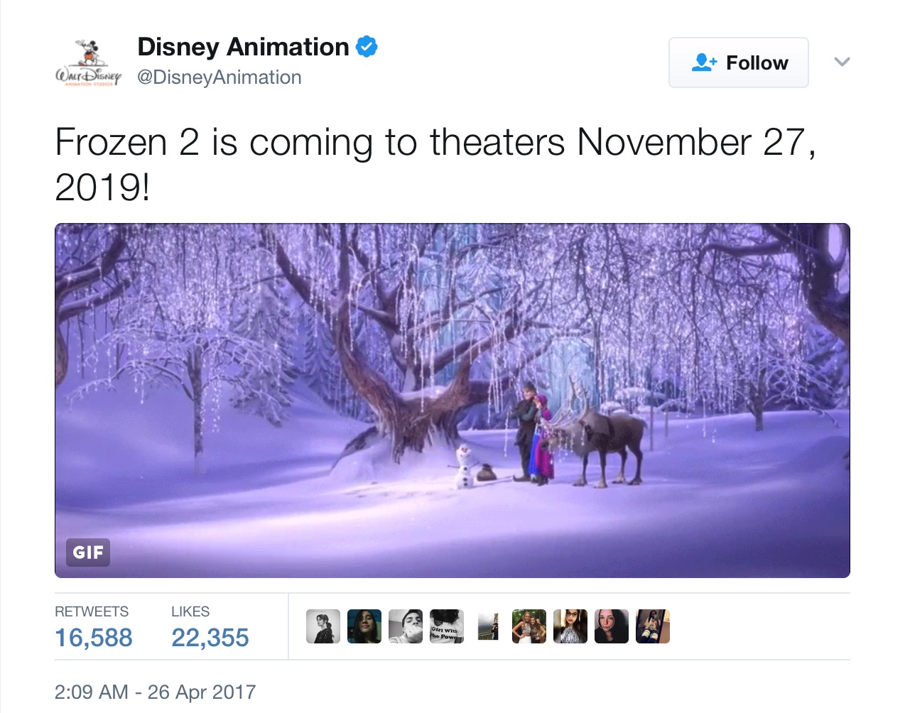 迪士尼動畫26日宣布:《冰雪奇緣》續集 將於2019年11月上映(圖/迪士尼動畫Twitter截圖)