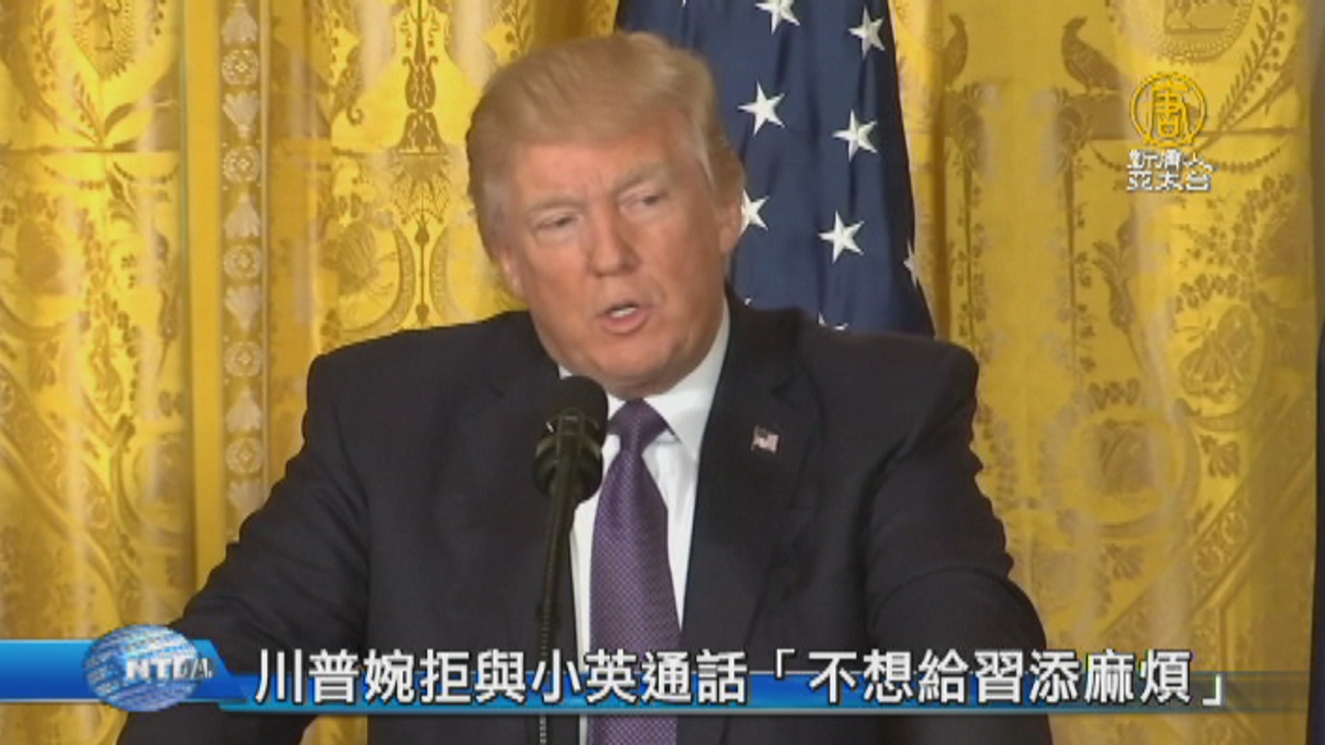 【新唐人亞太台 2017 年 04 月 28 日訊】蔡英文總統昨天接受路透社專訪,表示不排除跟川普總統本人能夠再通電話,尋求跟美國政府有更直接的溝通。不過,川普明確婉拒了第二次川蔡熱線的提議。據路透社報導,川普27號在白宮接受路透社專訪,他表示,他認為習近平正盡全力在遏止北韓進行任何新的飛彈試射或核試驗。他不希望在這個時候,去做會為習近平添麻煩的事。至於台灣有意買F-35戰機,川普說,還沒接到通知,他得想一想,然後再補上一句,台灣政府確實向美國買了很多裝備。