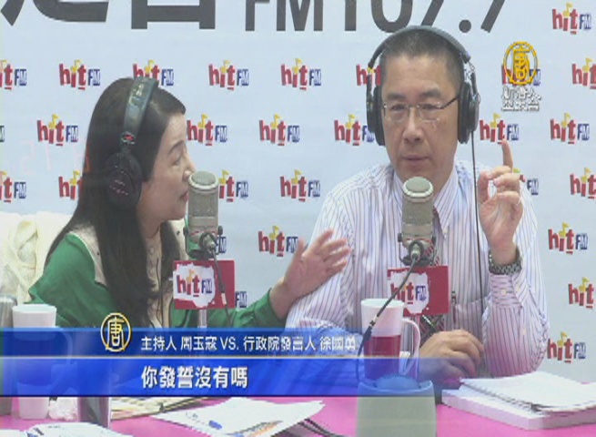 主持人 周玉寇 VS. 行政院發言人 徐國勇:「在當他(林全)這樣訪問當中,從來沒有感覺到有一個前瞻這種東西,突然冒出來大家就嚇一跳,所以才有說是彭淮南跑去跟蔡英文說,然後這個地下經濟部長何美玥這樣建議,甚至有傳言說,連林信義都要負責經濟跟國發會。沒有啦沒有,沒有這一回事。你發誓沒有嗎。沒有啦沒有沒有,真的沒有。那何美玥扮演什麼角色咧?她當然是一個,她是一個國策顧問嘛。她有沒有管行政院的前瞻基礎建設條例?每一個人都會提出建議,是這個樣子。但是事實上拍板定案的還是林全。」