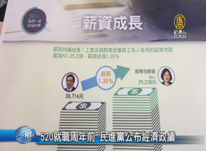 【新唐人亞太台 2017 年 05 月 04 日訊】民進黨今天(5月4日)公布執政近1年以來,在經濟方面的表現,包括GDP正成長,出口增加,全球競爭力排名上升到14名,失業率也下降到3.78%,讓數據證明,蔡政府有做出成績,也希望國人繼續一起努力。