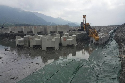 水利署第九河川局的堤防減災工程,下午傳出吊臂斷裂導致2工人受傷。(民眾提供)