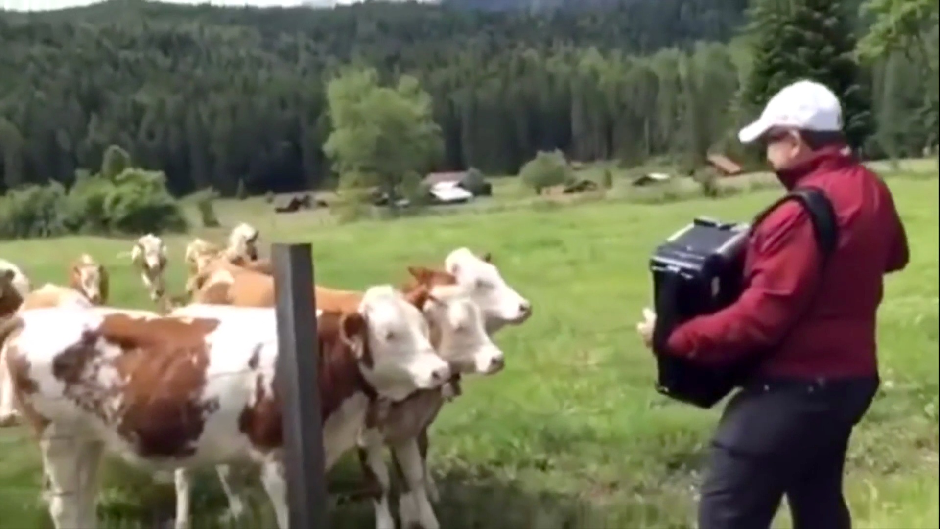 他把車停在路邊,抱著個手風琴衝著遠處正在安靜地吃著草的奶牛們開始彈奏。
